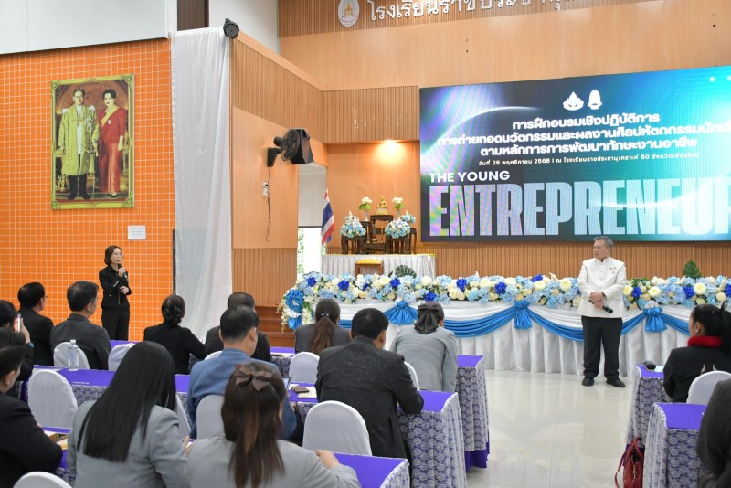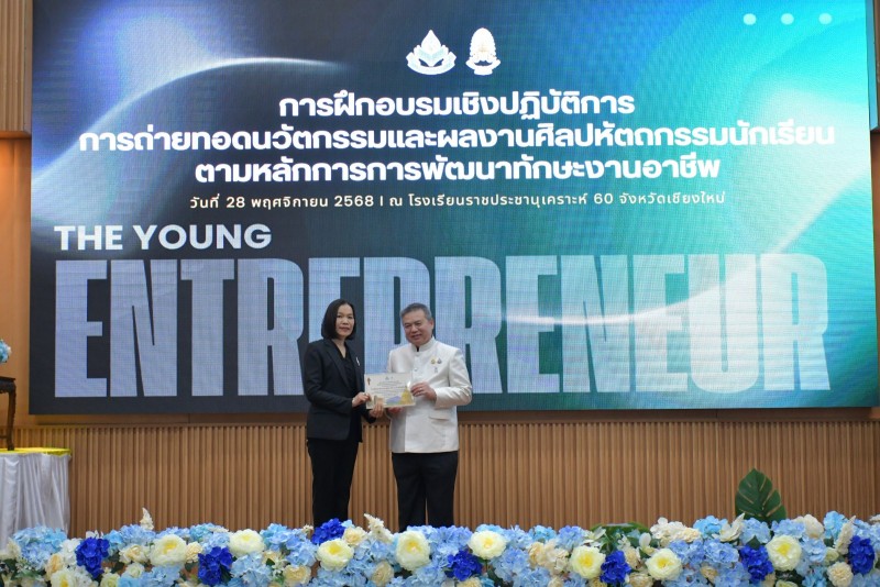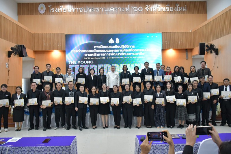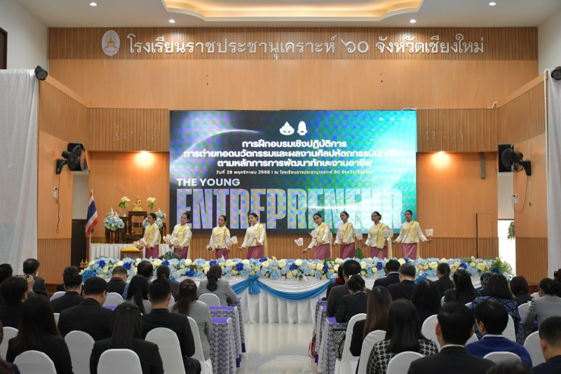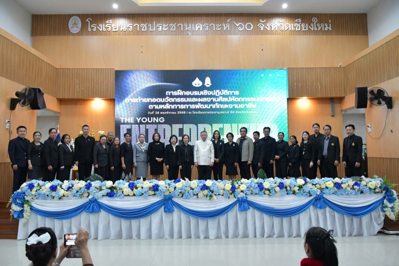 วันที่ 28 พฤศจิกายน 2568 นางประกาทิพย์ ผาสุข ผู้อำนวยการโรงเรียนราชประชานุเคราะห์ 60 จังหวัดเชียงใหม่ และคณะผู้บริหารสำนักบริหารงานการศึกษาพิเศษกลุ่ม 6 ให้การต้อนรับ นายชาญวิทย์ มุนิกานนท์ ที่ปรึกษารัฐมนตรีช่วยว่าการกระทรวงศึกษาธิการ ในโอกาสให้เกียรติเป็นประธานเปิด “การฝึกอบรมเชิงปฏิบัติการถ่ายทอดนวัตกรรมและผลงานศิลปหัตถกรรมนักเรียน ตามหลักการพัฒนาทักษะงานอาชีพของโครงการนักธุรกิจน้อยมีคุณธรรม นำสู่เศรษฐกิจสร้างสรรค์”